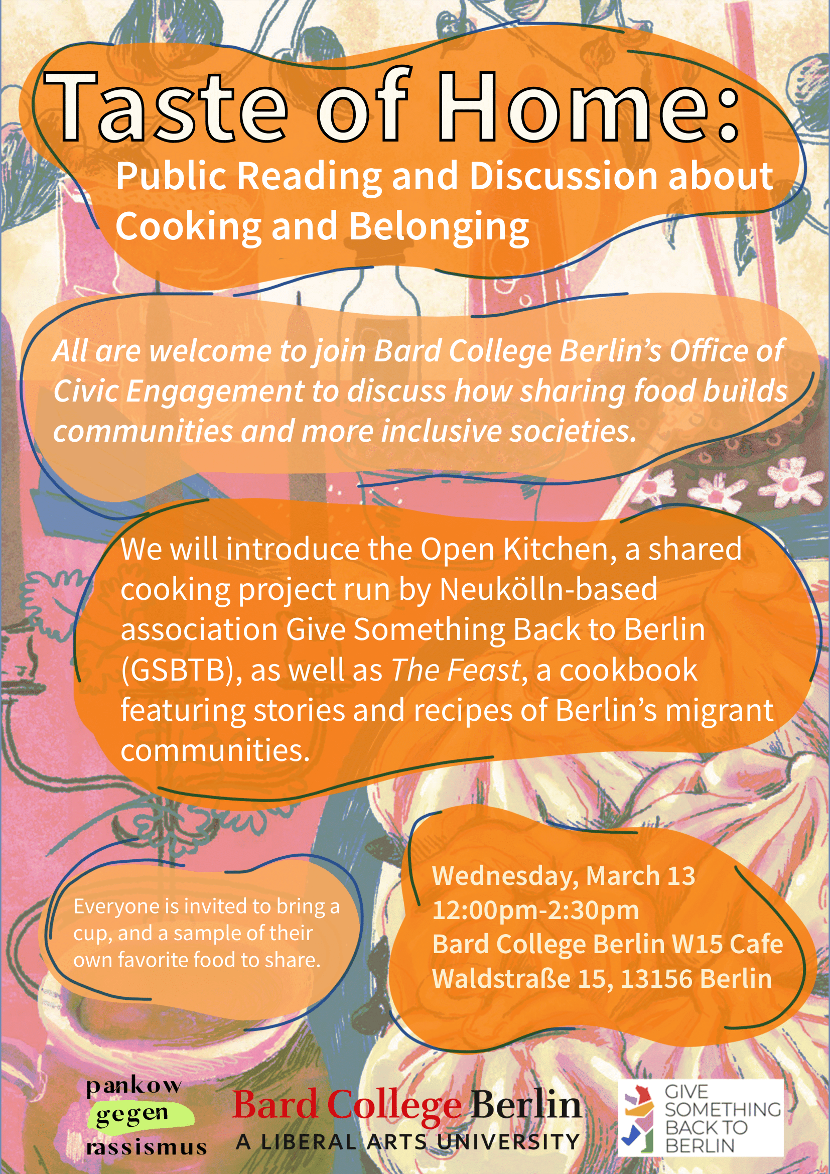 Join BCB's Office of Civic Engagement to get a taste of home from the Neukölln-based association Give Something Back to Berlin at the Bard College Berlin campus. This event is part of the 2024 Pankow Weeks Against Racism program. View the rest of BCB's Pankow Weeks Against Racism events here.12:00 pm – 2:30 pm CET/GMT+1