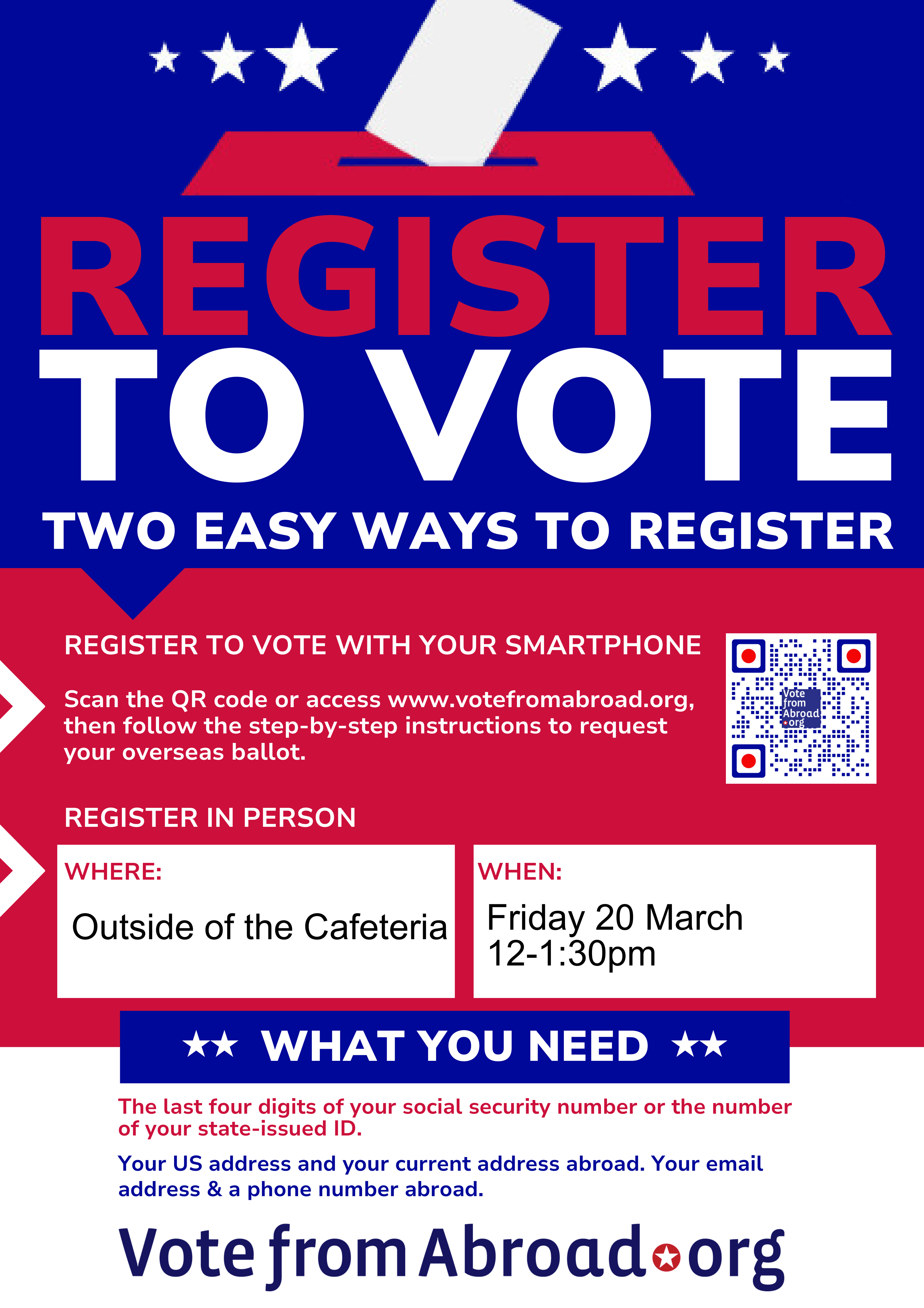 Volunteers from VoteFromAbroad.org will hold a VOTER HELP DESK on campus on Friday, March 20th from noon to 1:30 p.m. in the cafeteria to help American citizens request their overseas ballots for the 2026 midterm primary and general elections. Many states have June primaries so it’s vital to request your overseas ballot now.