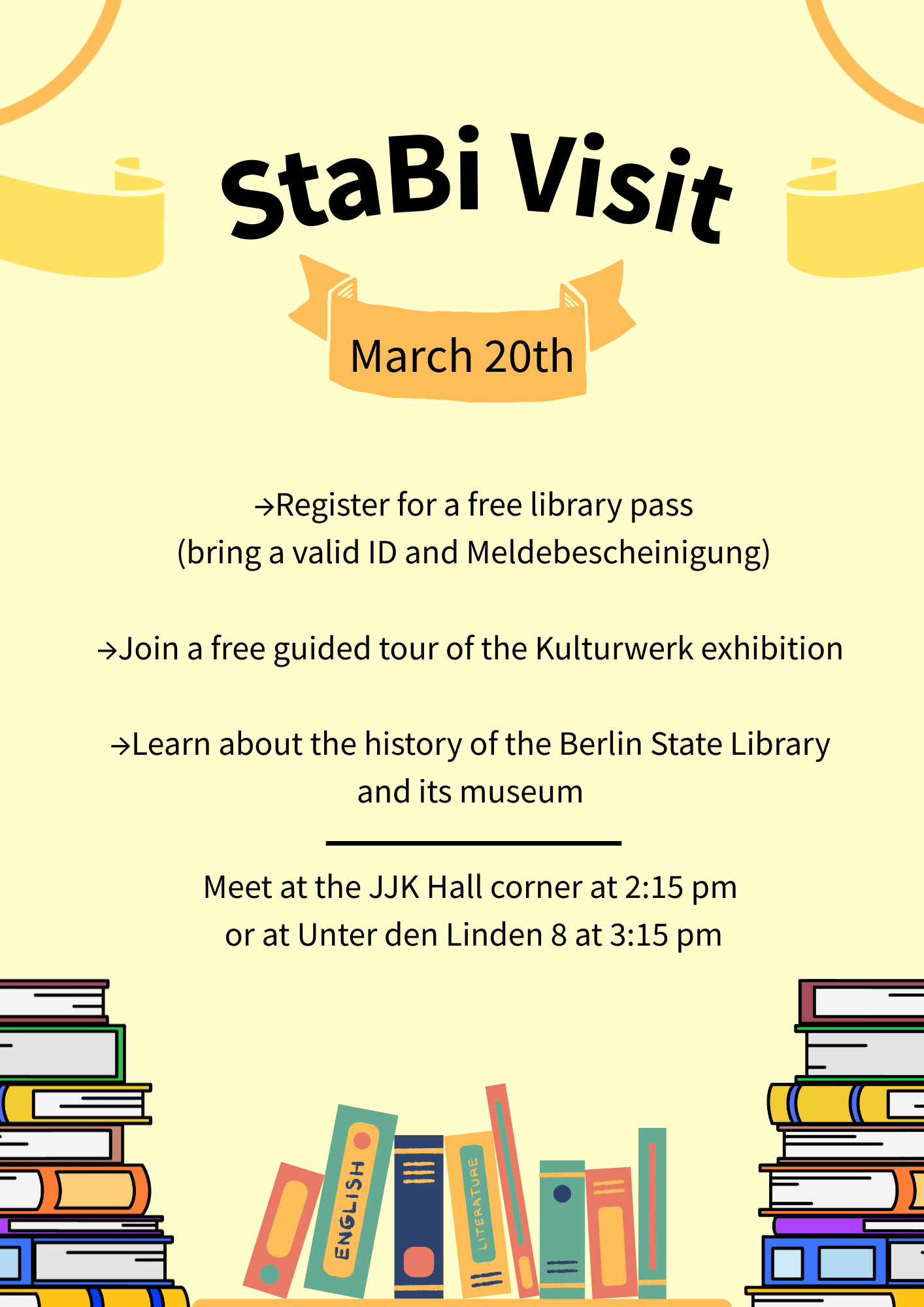 We will meet at the corner in front of JJK Hall (W15) at 2:15 pm. Those who want to meet us directly on site should be at StaBi Unter den Linden 8 at 3:15 pm.