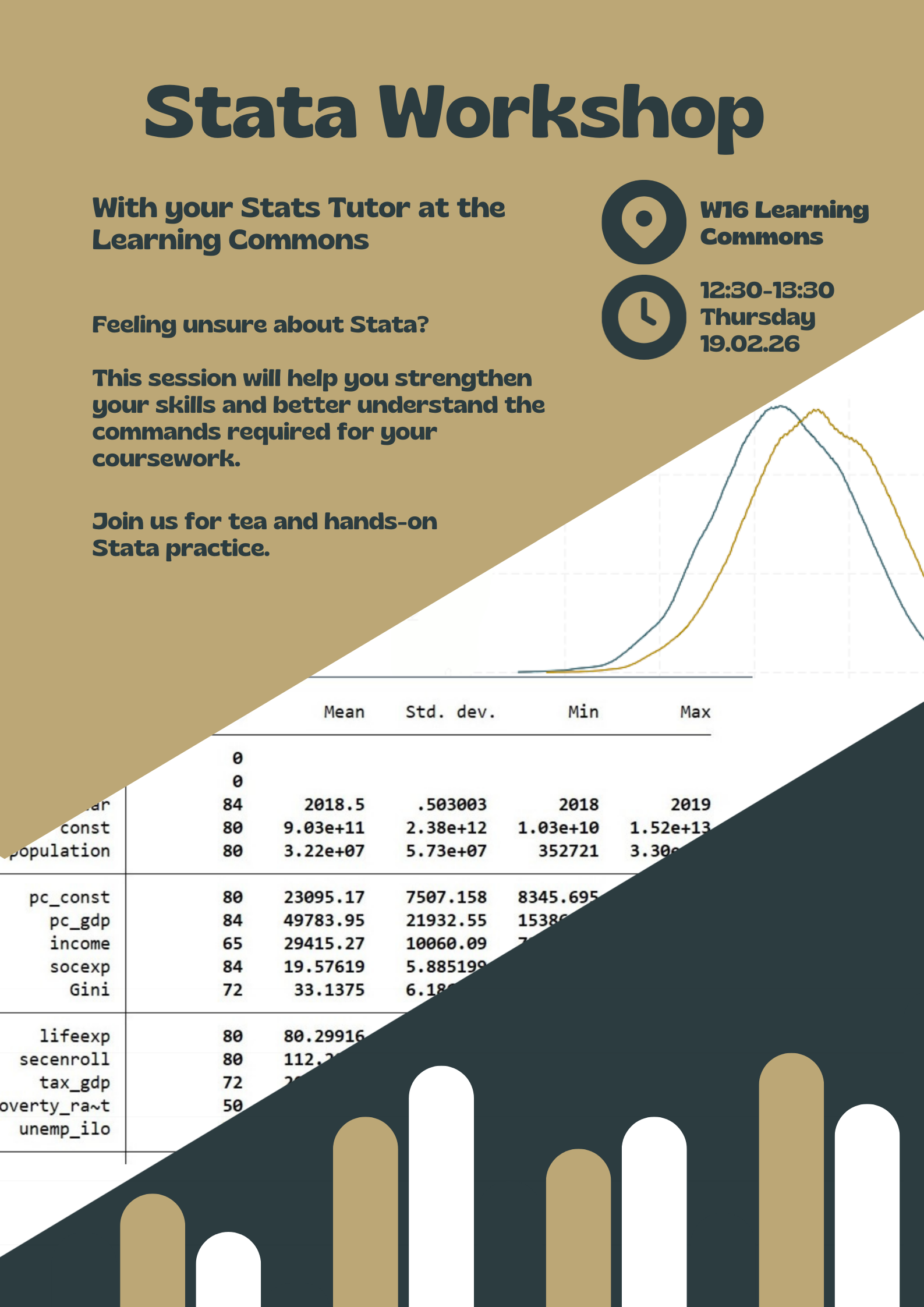 This session is meant to complement our lectures and give you more hands-on experience with the commands used in assignments. Mark your calendars! Bring your laptop, and let’s have some tea while we practise Stata together.