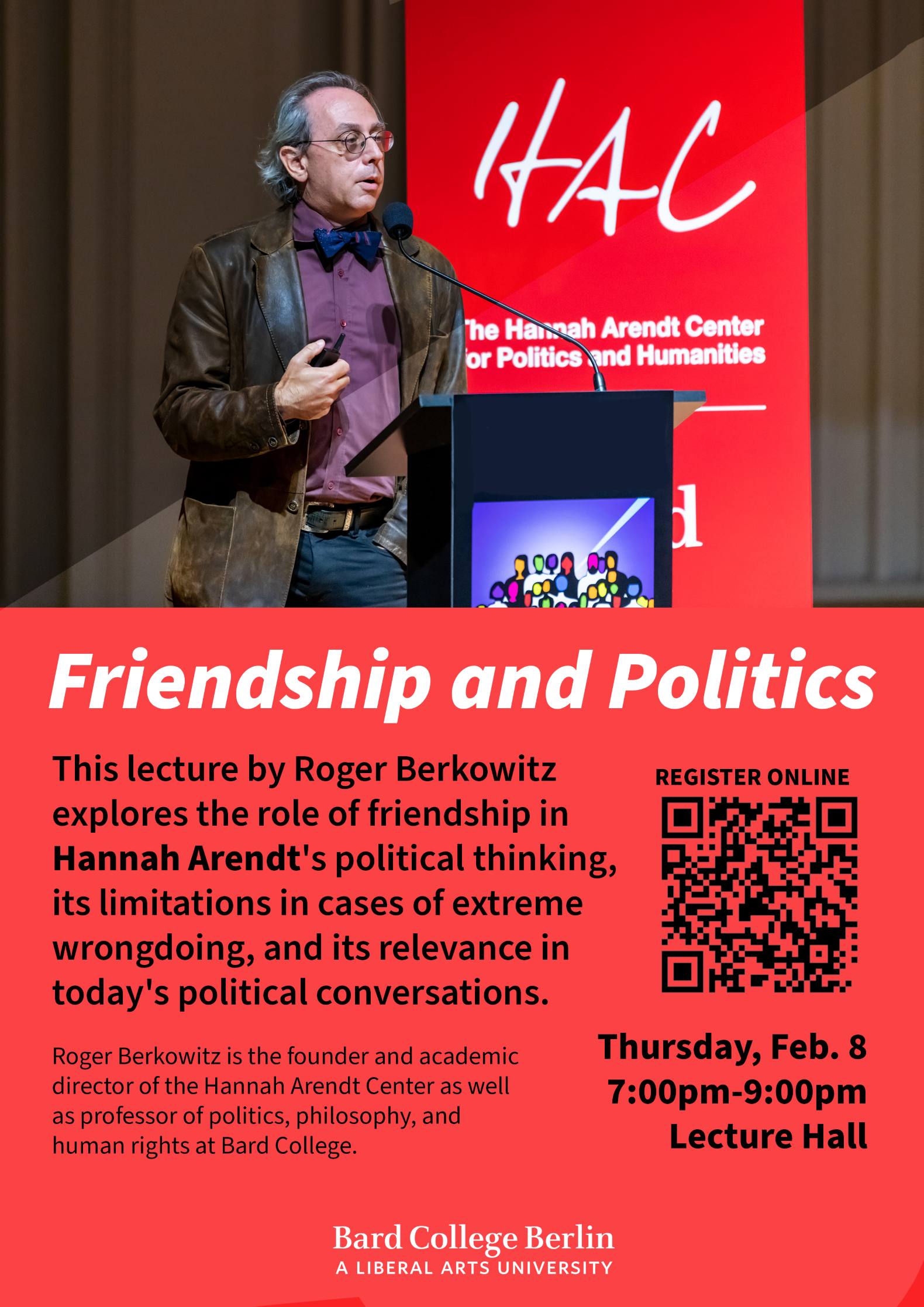 Roger Berkowitz is the founder and academic director of the Hannah Arendt Center as well as professor of politics, philosophy, and human rights at Bard College. Berkowitz writes and speaks about how justice is made present in the world. He is author of The Gift of Science: Leibniz and the Modern Legal Tradition, editor of Perils of Invention: Lying, Technology, and the Human Condition (2022), coeditor of Artifacts of Thinking: Reading Hannah Arendt's Denktagebuch (2017), Thinking in Dark Times: Hannah Arendt on Ethics and Politics (2010), The Intellectual Origins of the Global Financial Crisis (2012), and editor of the annual journal HA: The Journal of the Hannah Arendt Center and the Arendt Center weekly newsletter, Amor Mundi. His writings have appeared in numerous venues such as The New York Times, The Chronicle of Higher Education, and The Paris Review online. In 2019, Berkowitz received the Hannah Arendt Award for Political Thought given by the Heinrich Böll Stiftung in Bremen, Germany.