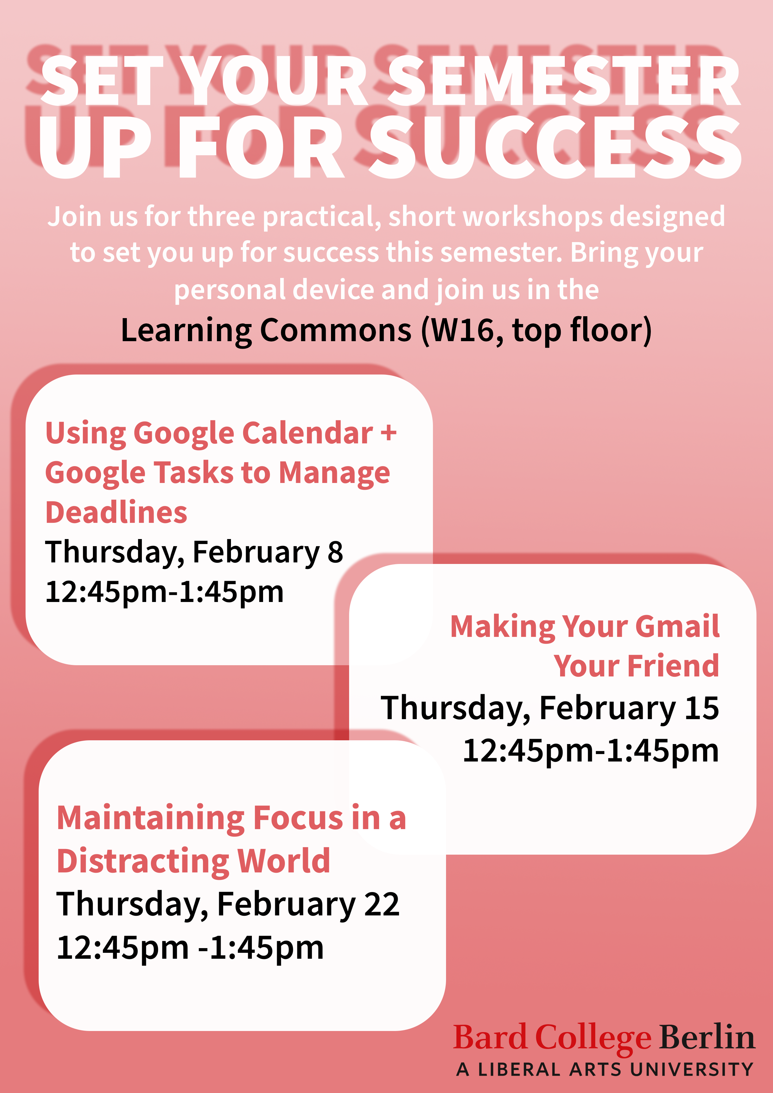 Join us for three practical, short, hands-on workshops designed to set you up for success this semester. At each workshop there will be a short presentation and then time to implement some of the tools we discuss. Bring your personal device and join us in the Learning Commons!