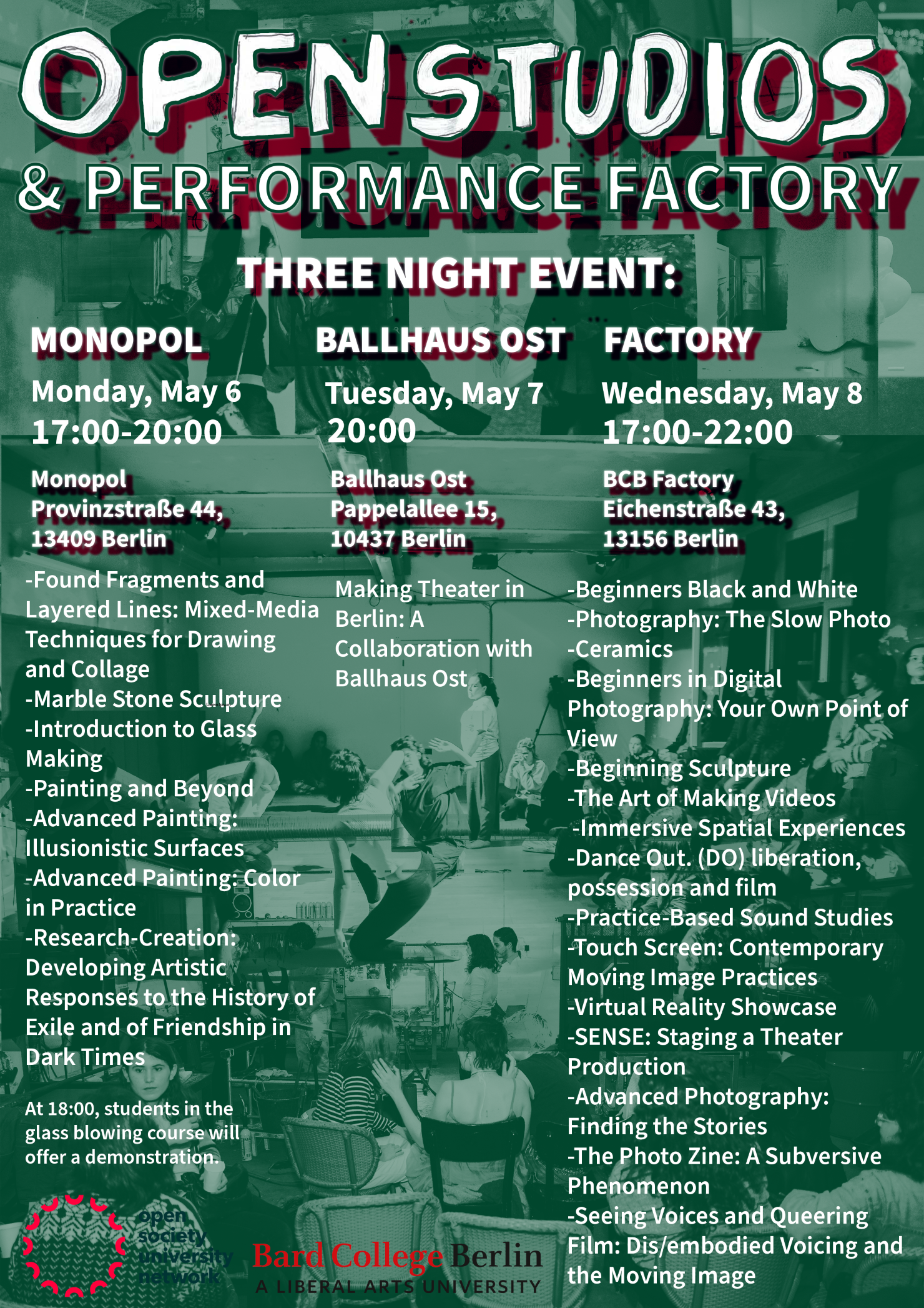 On December 12, visual and performing arts students will showcase their work at the Factory (Eichenstraße 43, 13156 Berlin). View more information here.
