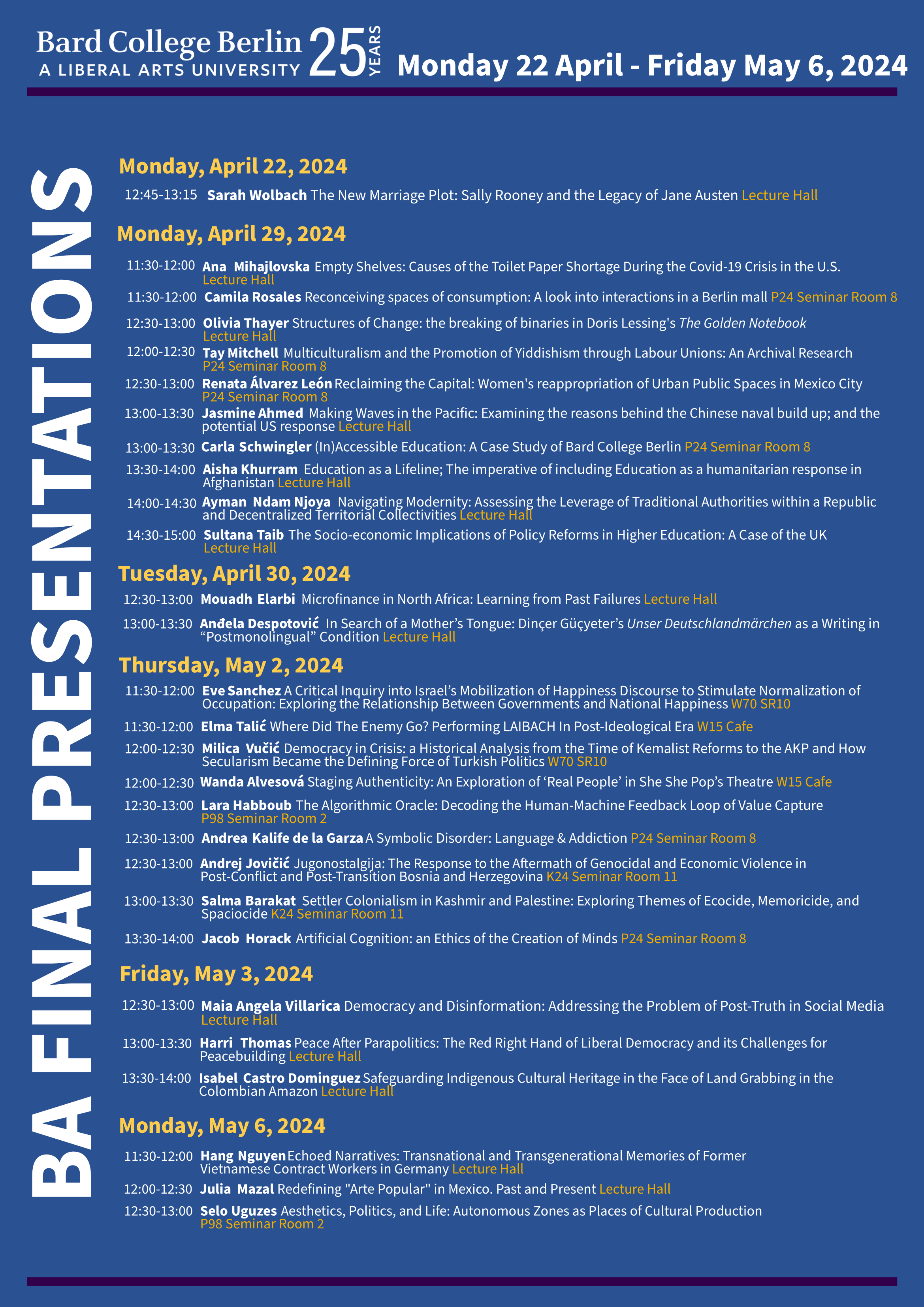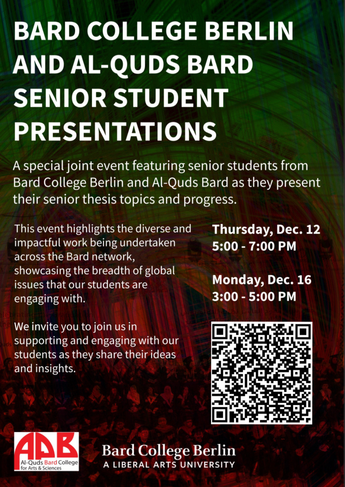 A special two-day event (December 12 and December 16) featuring senior students from Bard College Berlin and Al-Quds Bard as they present their senior thesis topics and progress. This event highlights the diverse and impactful work being undertaken across the Bard network, showcasing the breadth of global issues that our students are engaging with.