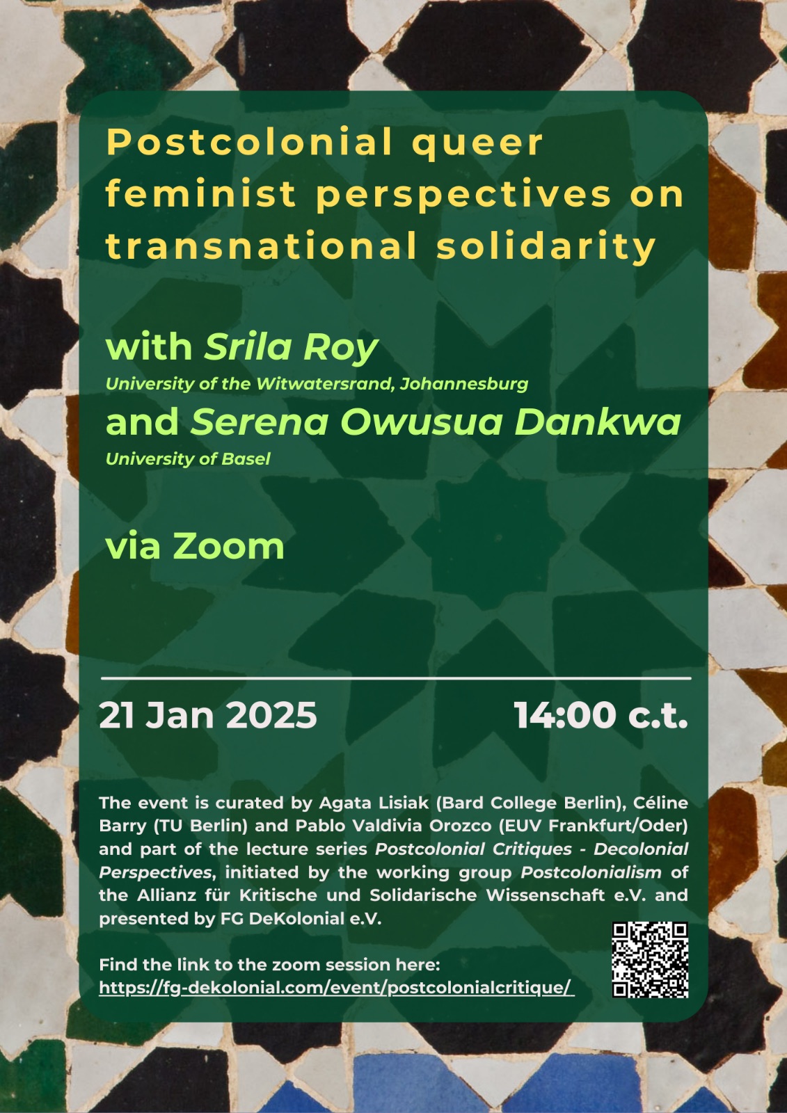 Part of Postcolonial Critiques – Decolonial Perspectives, a hybrid Lecture Series initiated by AG Postkolonialismus of Allianz für Kritische und Solidarische Wissenschaft and presented by FG DeKolonial e.V.