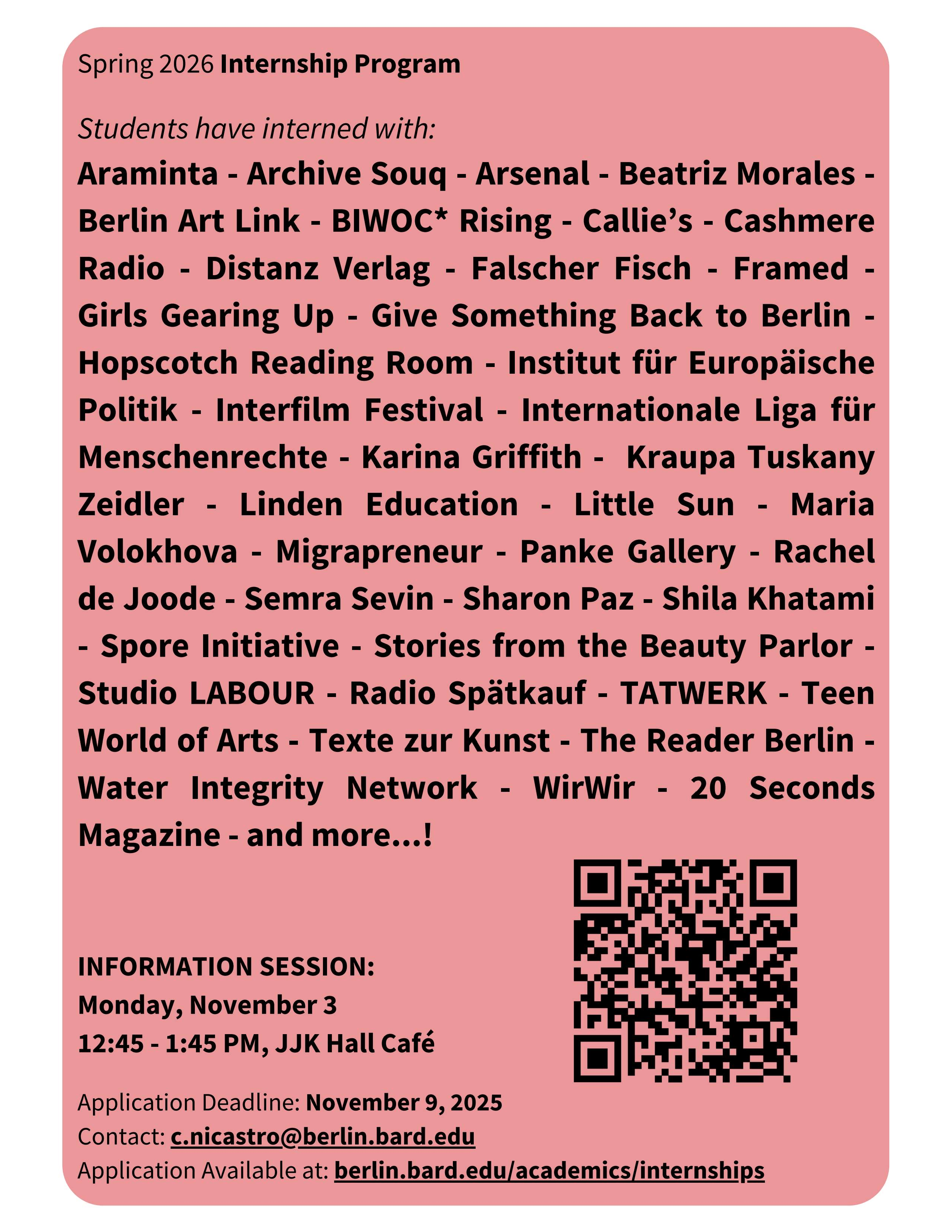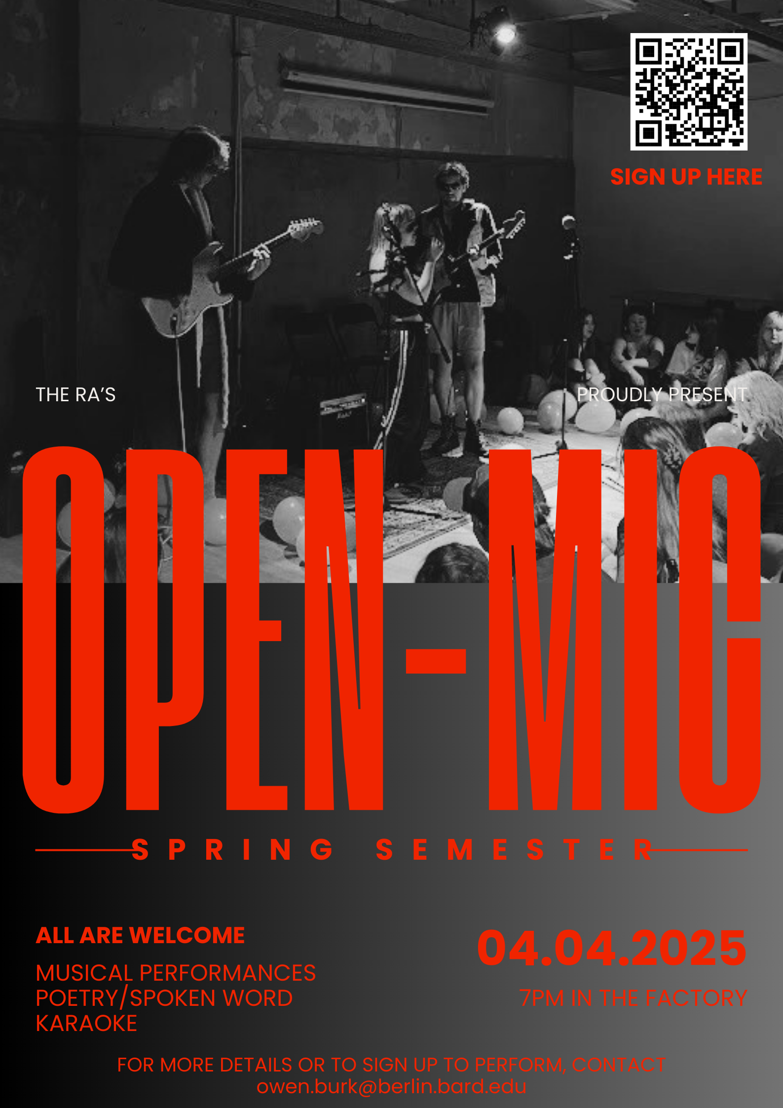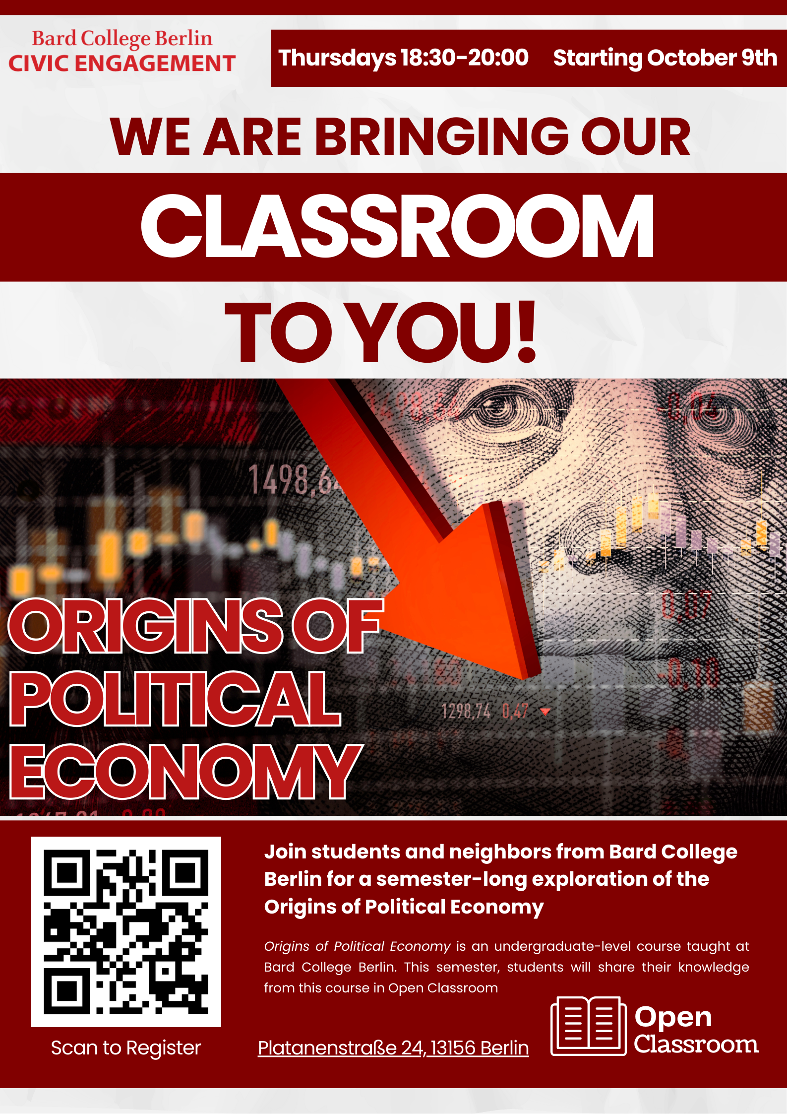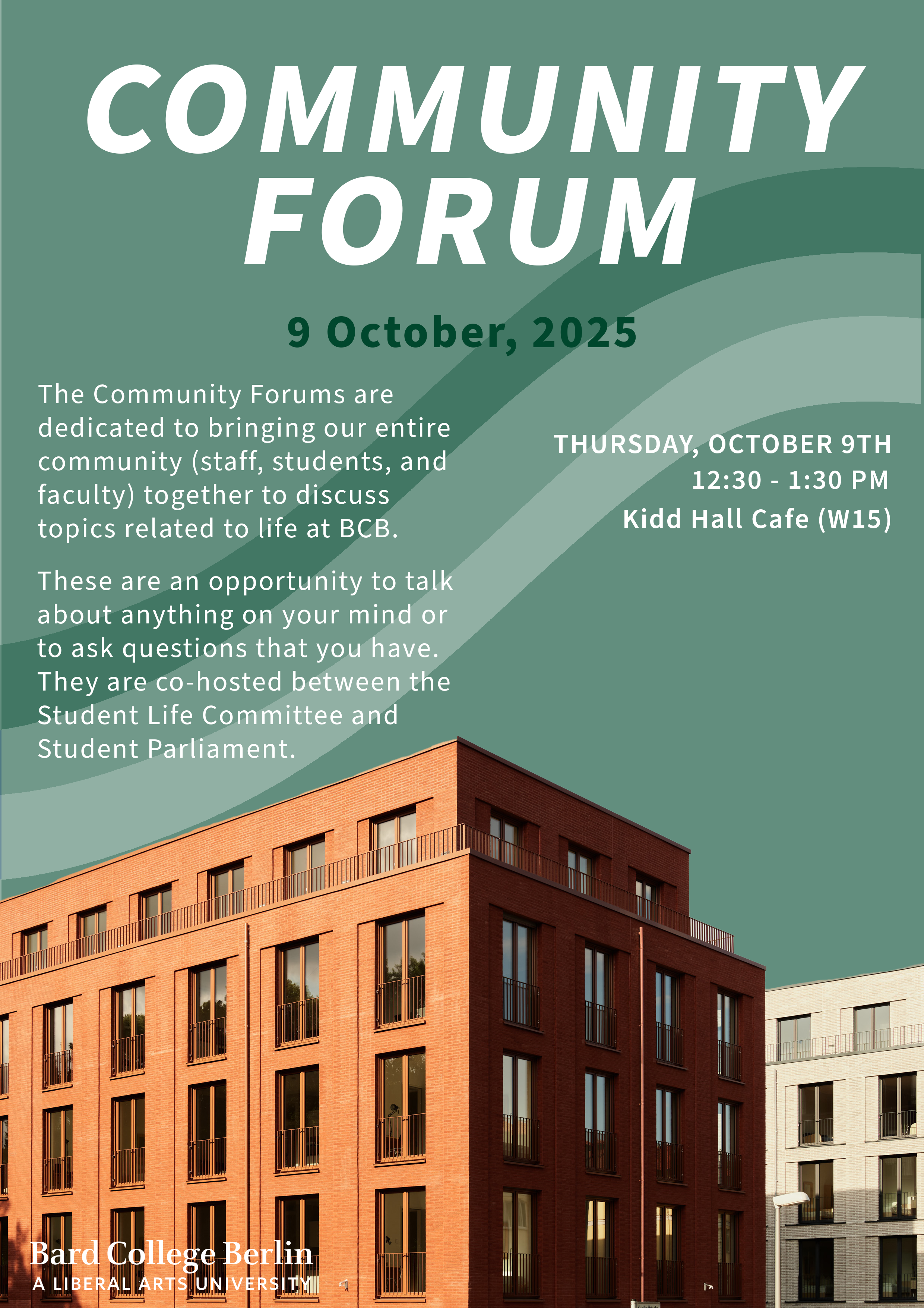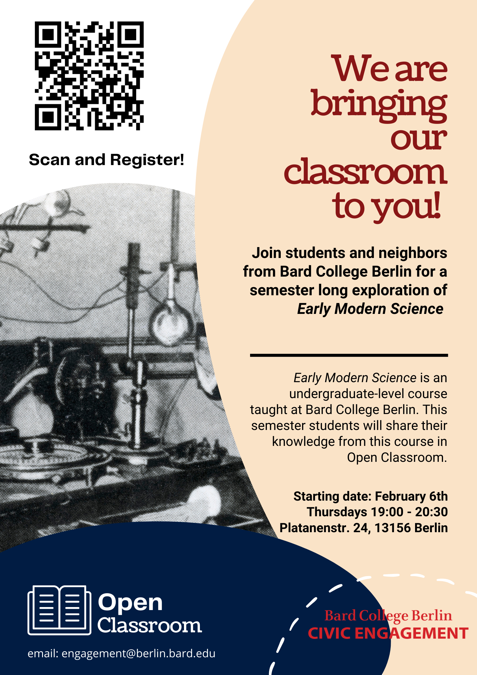 Open Classroom allows people to experience university-level courses taught at Bard College Berlin in an informal setting that is open to everyone. It also aims to engage students to share the knowledge gained in the courses they attend as a part of their curriculum. Takes place every Thursday.