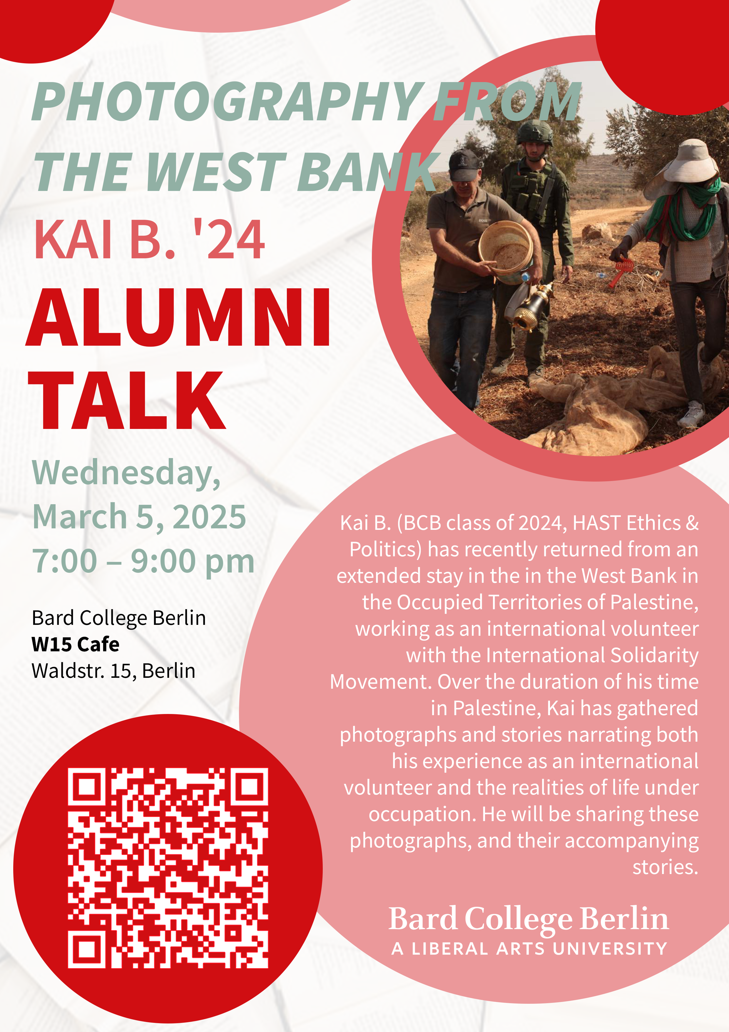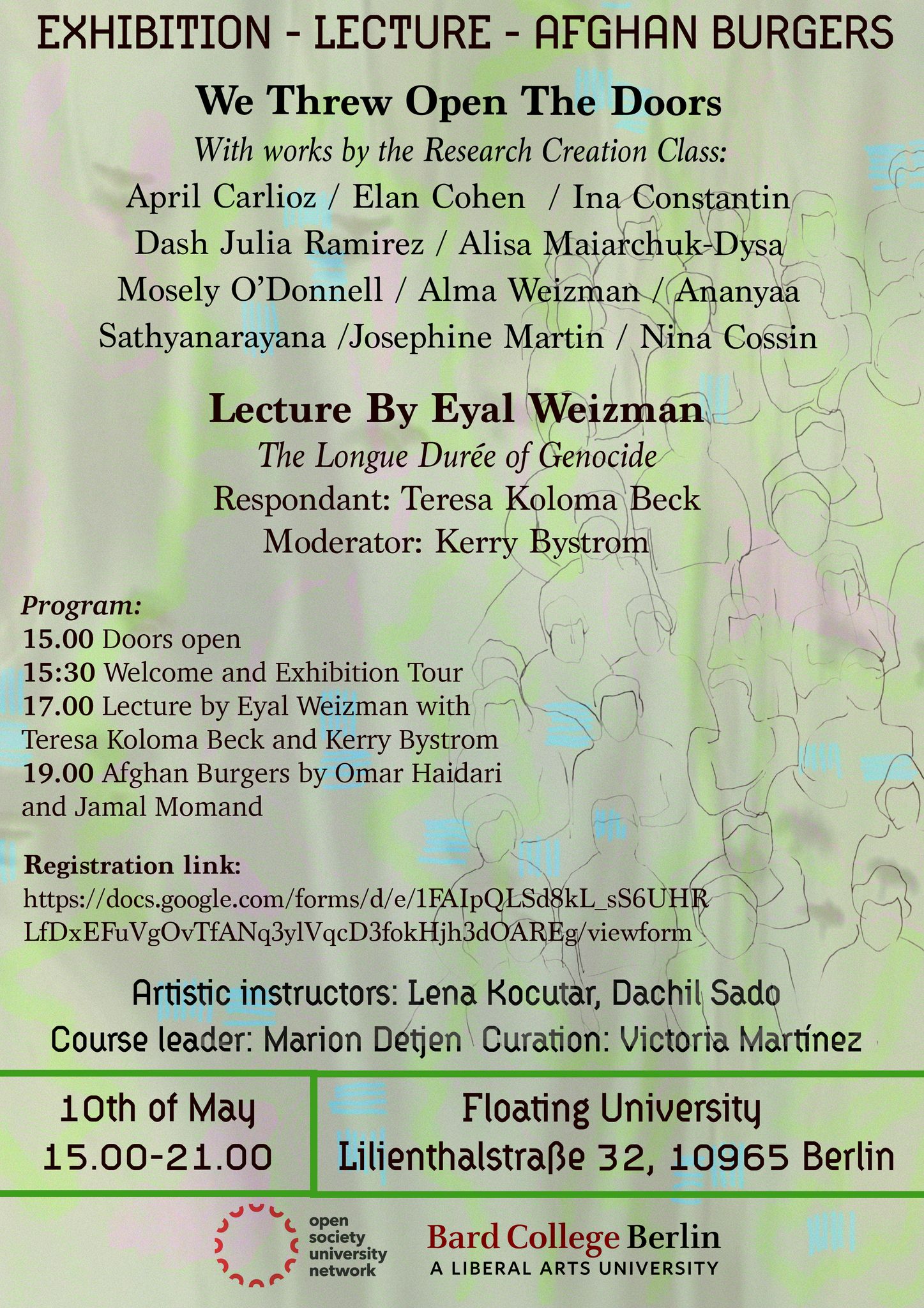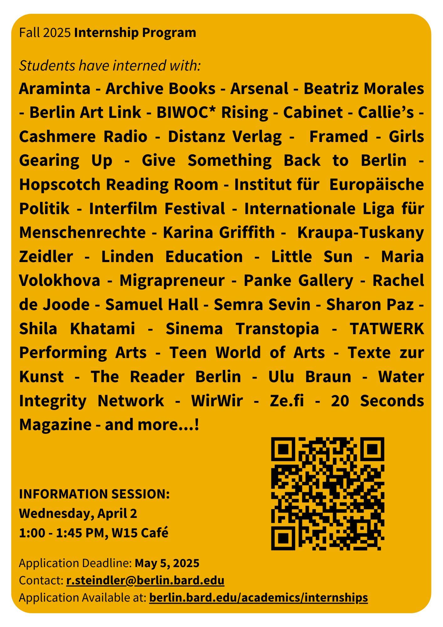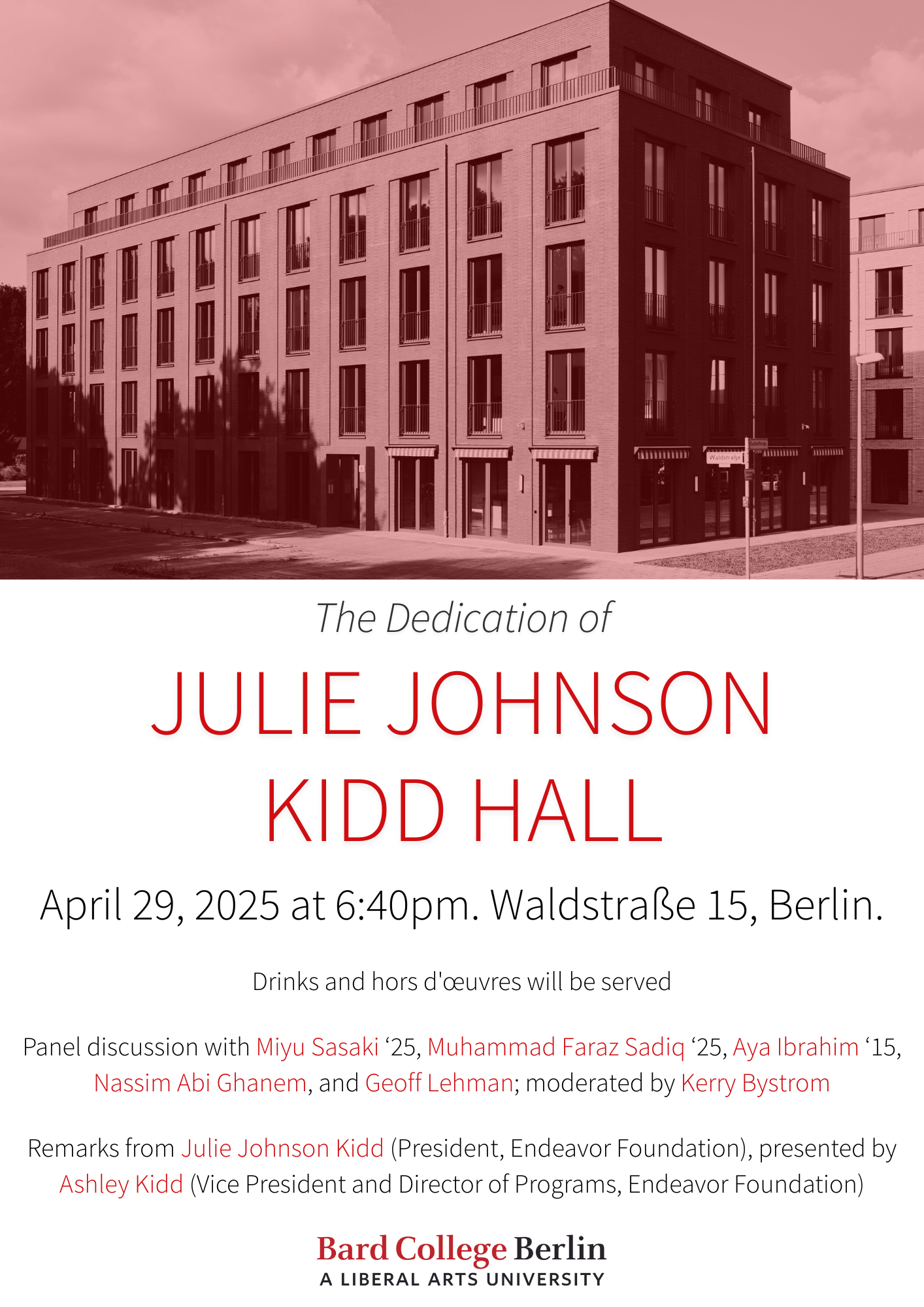 Open Classroom allows people to experience university-level courses taught at Bard College Berlin in an informal setting that is open to everyone. It also aims to engage students to share the knowledge gained in the courses they attend as a part of their curriculum. Takes place every Thursday.