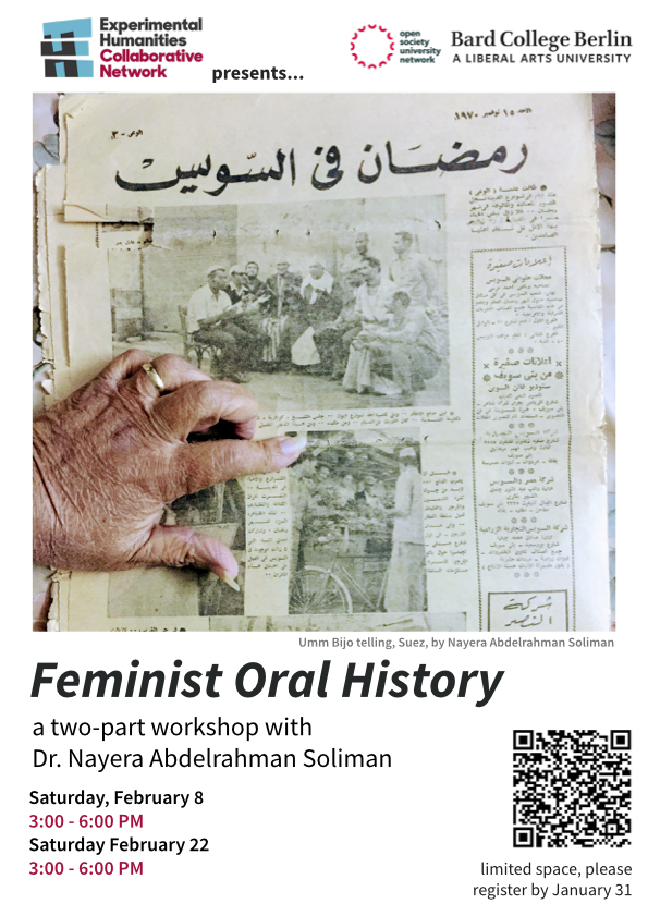 In this two-part workshop, we will explore both the theory and practice of oral history, with a focus on feminist influences in its development. The first part will center on the theory and methodology of feminist oral history, after which participants will be invited to conduct their own oral history interviews. In the second part of the workshop, we will review participants’ work and explore existing online oral history archives from the North Africa and West Asia region. Toward the end of the workshop, we will reflect on what makes oral history feminist and how it can inform our research, studies, and understanding of how history can be written.