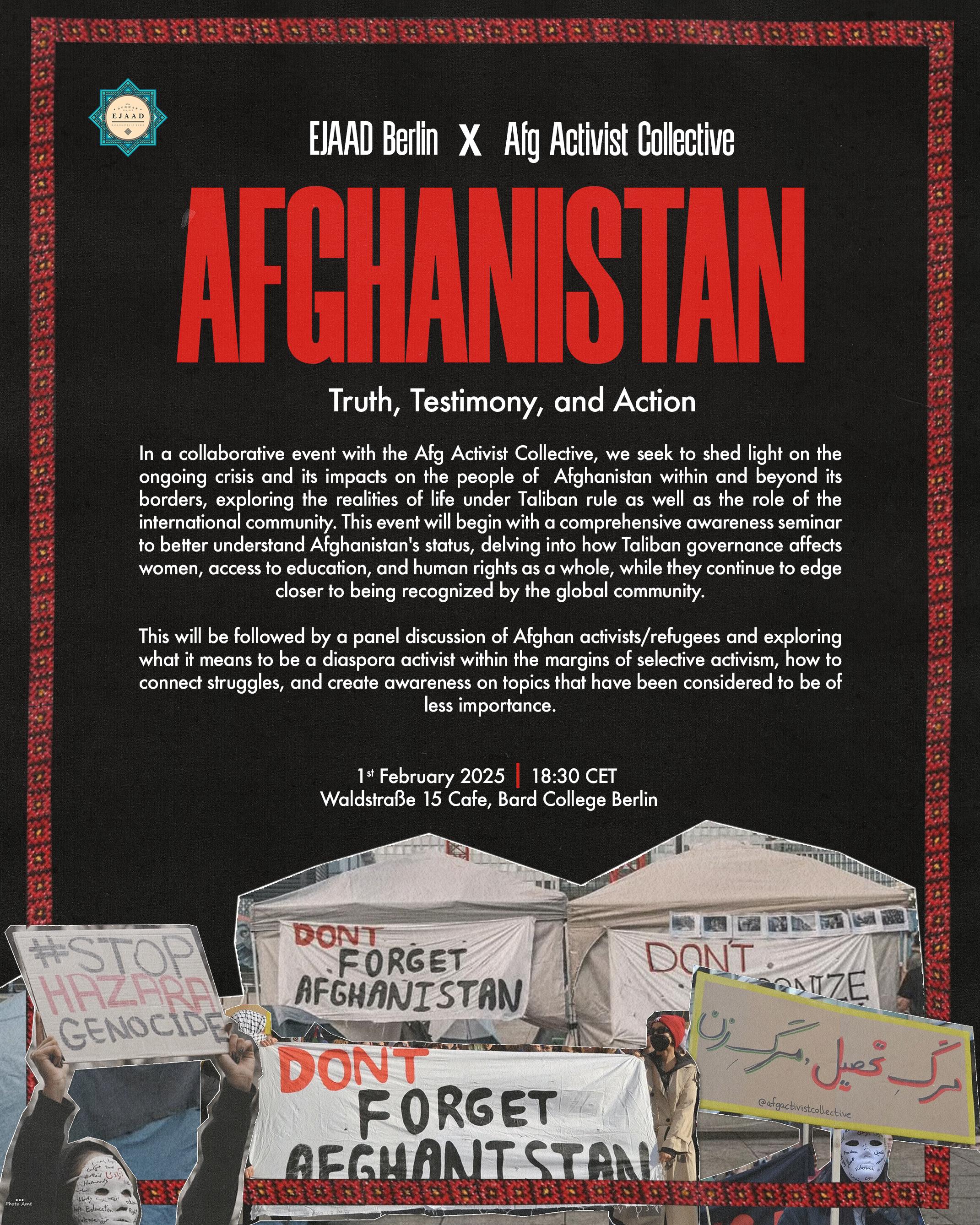 In a collaborative event with the Afghan Activist Collective, we seek to shed light on the ongoing Afghanistan crisis and its impacts on Afghans within and beyond the borders. Exploring the realities of life under Taliban rule, this event begins with a comprehensive awareness seminar to better understand Afghanistan's status. Delving into how Taliban governance affects women, access to education, and human rights as a whole. This is followed by a panel discussion of Afghan activists/refugees exploring what it means to be a diaspora activist? Why leave home behind? And at what expense?