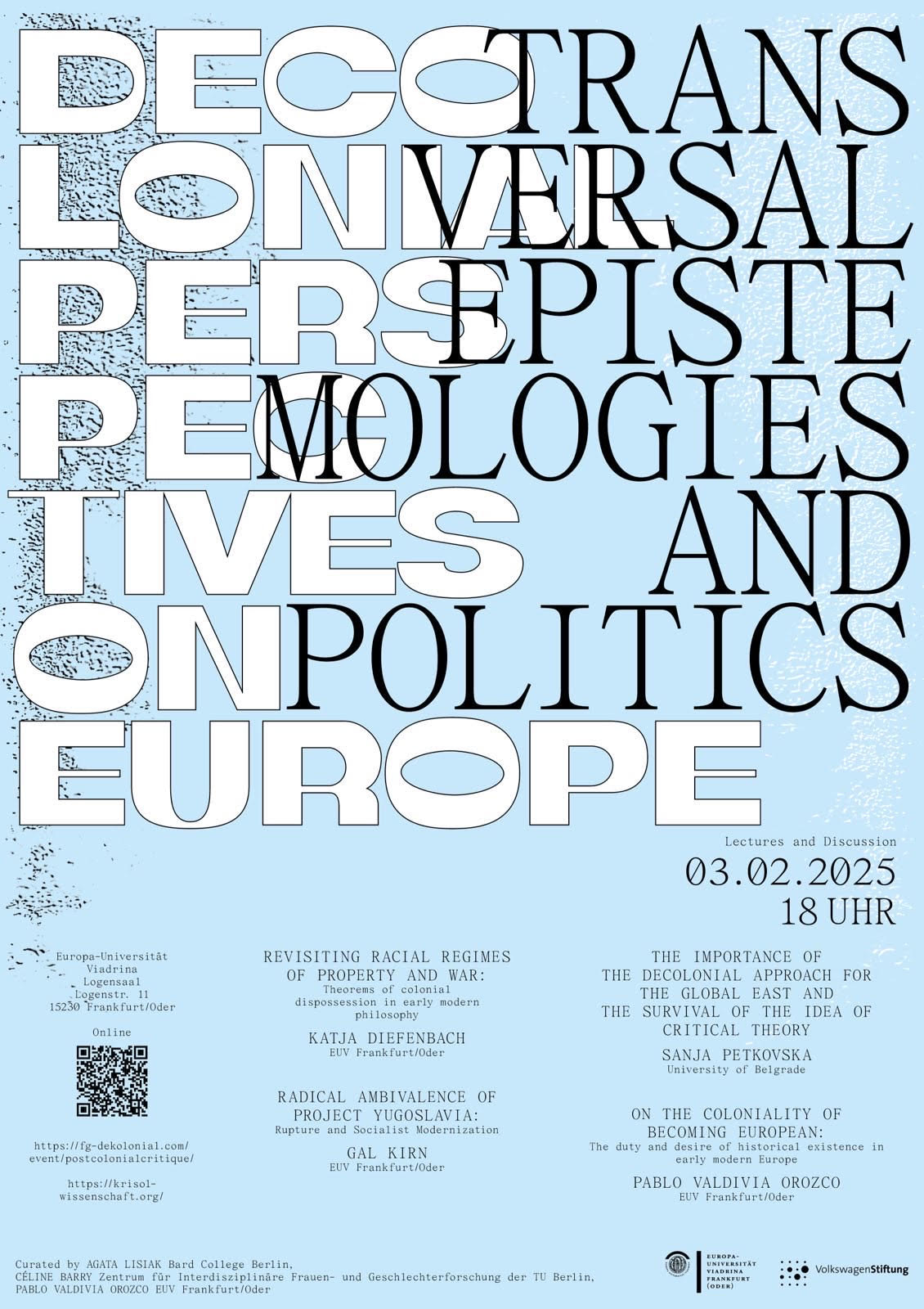 In this session, we will report on current projects and highlight the urgency of decolonial and postcolonial approaches for achieving a deeper understanding of European traditions. Through brief inputs from philosophy, cultural, and literary studies, we will discuss the constitutive role of colonial violence in the formation of European cultures, as well as how it has been resisted. Additionally, we will reflect on how decolonial and postcolonial critiques provide, on one hand, a precise understanding of structures of violence and power, and on the other hand, open up possibilities for transversal critique and solidarities beyond ethnic identities.