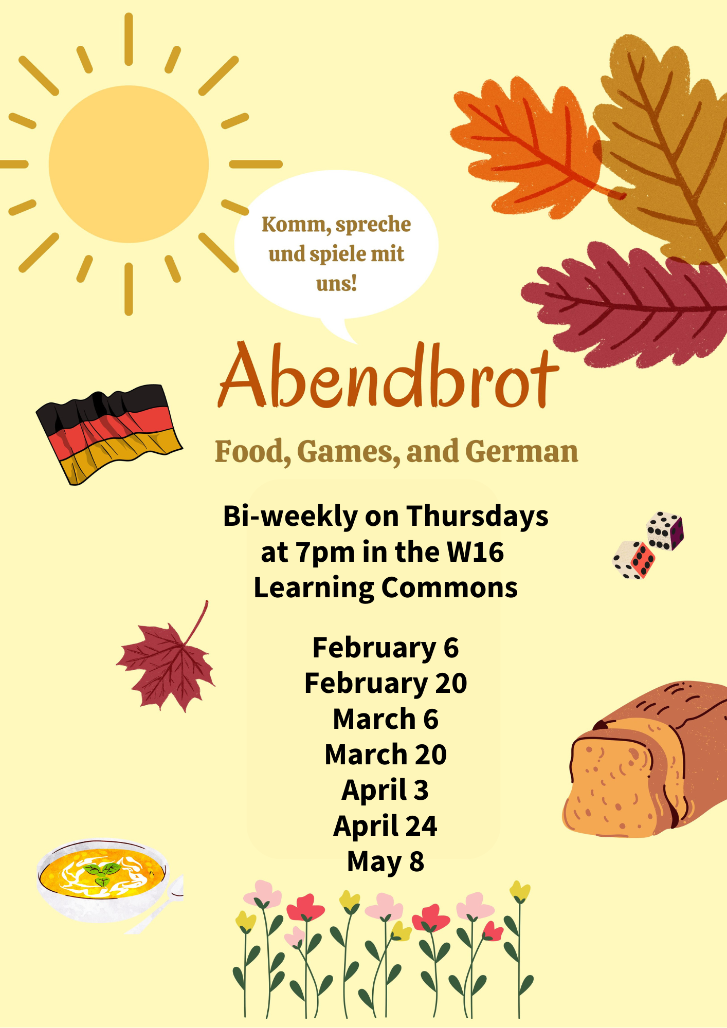 Kick off the holiday season with the last Abendbrot of the semester! We’ll bake chocolate-chip cookies, sip hot chocolate, and enjoy a warm evening together. Let’s unwind from the semester, enjoy sweet treats and have some cosy German conversations with each other.