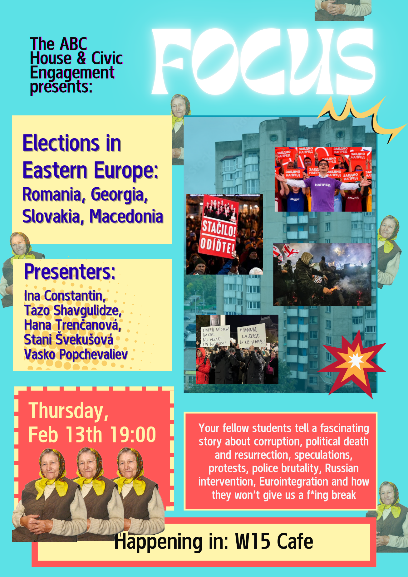 FOCUS is back in the new semester! This time in focus are the recent elections in Eastern Europe and their aftermath. Feel like you're missing some information? Your fellow students are here to fill you in on anything you might have missed and give insight into the internal and regional dynamics in the wake of the Russian invasion of Ukraine and the rise of the far-right. Ina, Tazo, Vasko, Stani, and Hana will speak about their first-hand experiences of elections from Romania, Georgia, Macedonia, and Slovakia. The short presentations will be followed by an open discussion with questions and comments.