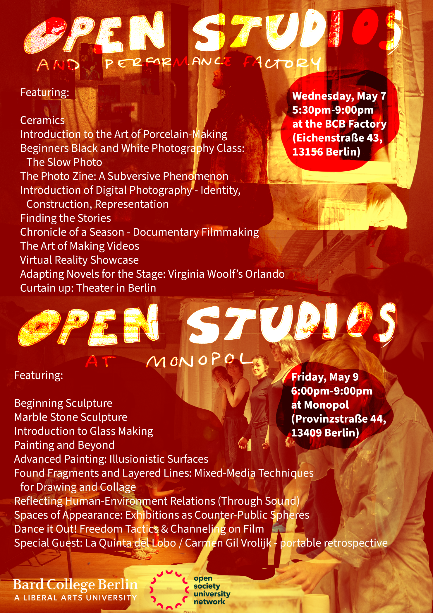 Open Studios and Performance Factory on Thursday, December 11 consists of exhibitions and performances by students from the following classes: The Study and Staging of Epic Theater Performance and Digital Culture From Street to Stage: Experimenting with Rimini Protokoll's Approach to Documentary Theater The Photo Zine: A Subversive Phenomenon Advanced Photography: Analog 4eva Immersive Spatial Experiences How Long Is Now? – A Photographic Portrait of Berlin Introduction to Digital Photography: Identity Construction and Representation Digital Filmmaking I: Idea & Form Ceramics Creative Component: Zabihullah Akbar