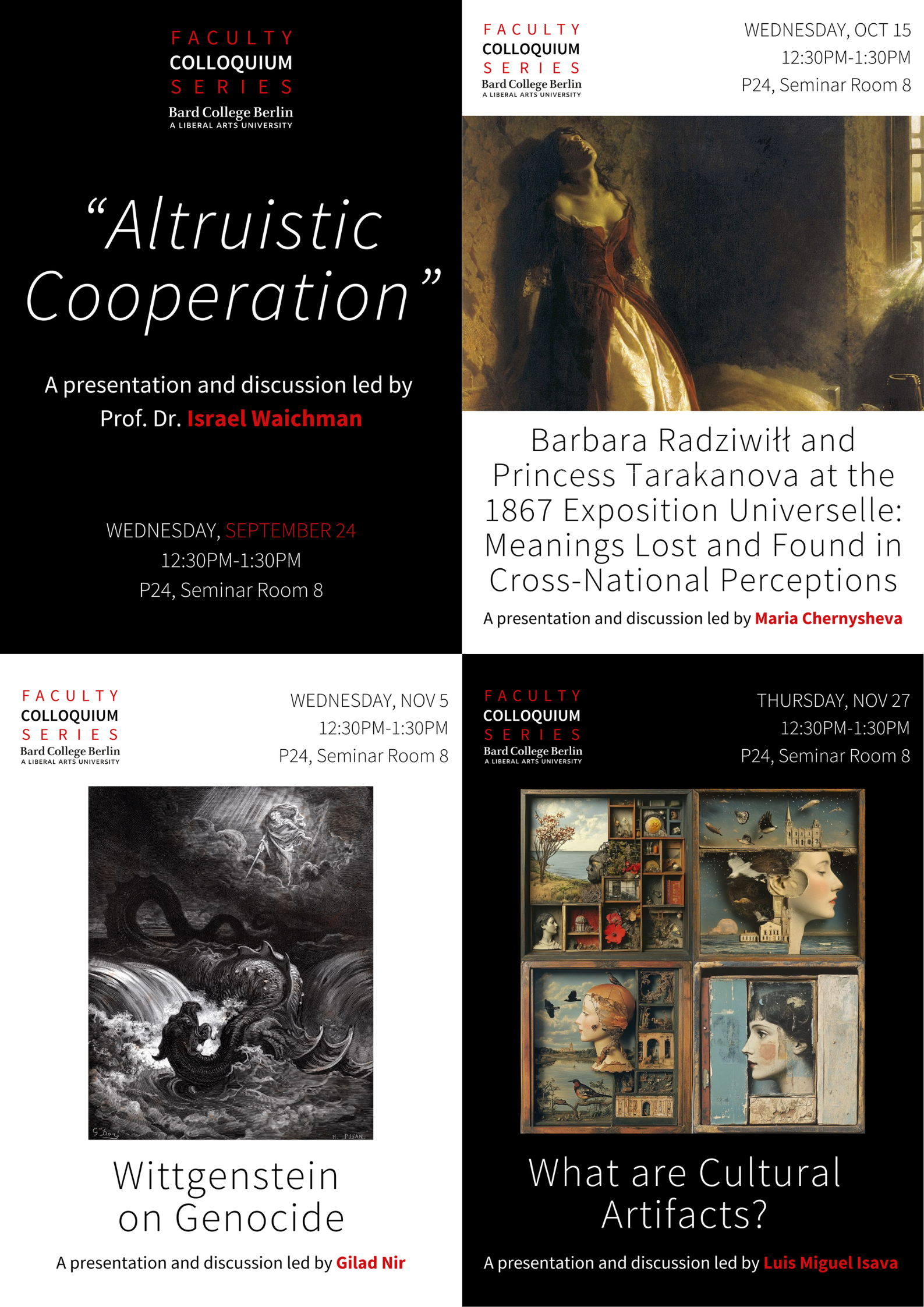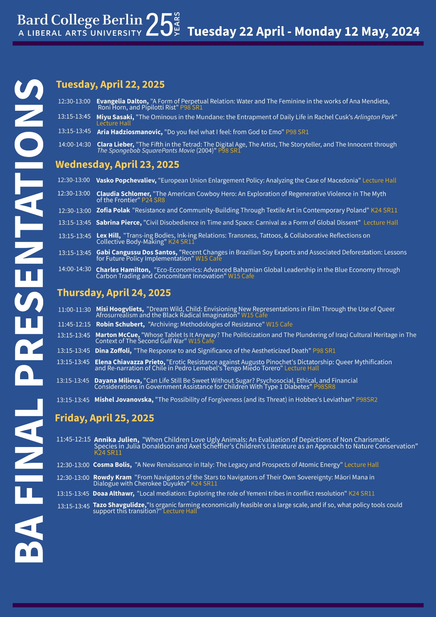 Tuesday, November 25: 12:30-13:00 - Tahmina Ataee, "Should I Stay or Should I Go? Understanding Migration Aspirations and Return Intentions of Afghan University Students Post-2021" (P98A Lecture Hall) 13:15-13:45 - Hana Lotfy, "Mimetic Desire: Zelda and Scott Fitzgerald and How They Became Fiction" (P98A Lecture Hall) 13:15-13:45 - Nesar Faizi, "The Impact of Selling Through Zalando on Mammut's Brand Positioning within the Competitive Outdoor Apparel Market" (P24 Seminar Room 8) 15:45-16:15 - Marley Heltai, "Dystopian Realities: Reproductive Autonomy and the Rhetoric of Care in the Age of Dobbs" (K24 Seminar Room 11)Wednesday, November 26: 12:30-13:00 - Ehsan ul haq, "Poverty Reduction and Human Capital Development in Pakistan: Evaluating the Impact of the 18th Amendment and Sustainable Development Goals" (P98A Lecture Hall) 13:15-13:45 - Sofiia Slonovska, "The Gathering Storm? Hegemonic Transitions and the Conditions of Great Power War" (P98A Lecture Hall)Tuesday, December 2: 12:30-13:00 - Maya Lakshmi Lascelles Jones, "The Desert as Reflective Aesthetic Terrain: Ontological and Phenomenological Inquiry Through the Visual Culture of the Desert Site" (P98A Lecture Hall) 13:15-13:45 - Zabihullah Akbar, "Circles of Exile: Dancing Afghan Identity in Berlin" (P98A Lecture Hall)Wednesday, December 3: 13:30-13:00 - Ahmed Mustafa, "People Power Vs Paper Power: Syrian Diaspora Activism in Germany, International Diplomacy and the Power of Documents in the Wake of the Fall of the Assad Regime" (P98A Lecture Hall) *13:30-14:00 - Nora Stone Roig, "The Wood Began to Move Haunted Landscapes and the Stimmung of End-Times" (P98A Lecture Hall) *corrected timeThursday, December 4: 12:30-13:00 - Masooma Hashemi, "Women’s Economic Contribution in Afghanistan (1960–2021)" (P98A Lecture Hall) 13:15-13:45 - Michaella Toscano Vielma, "Undoing the Task: How Contemporary Translators Reconfigure Walter Benjamin into the Anti-Philosophical" (P98A Lecture Hall)Thursday, December 11: 12:30-13:00 - Elizaveta Savitskaia, "Community and Judgment in Nick Riggle’s Aesthetic Theory" (P98A Lecture Hall) 13:15-13:45 - Frishta Hashimi, "How the Hawala System in Afghanistan Shapes Trust among Individuals and Small Businesses: A Case Study of Afghan Migrants and Their Use of Hawala for Cross-Border Remittances?" (P24 Seminar Room 8) 13:15-13:45 - Štěpánka Slámová, "FDI and Regional Disparities in the Visegrad Four: Did COVID-19 Widen the Gap?" (P98A Lecture Hall)