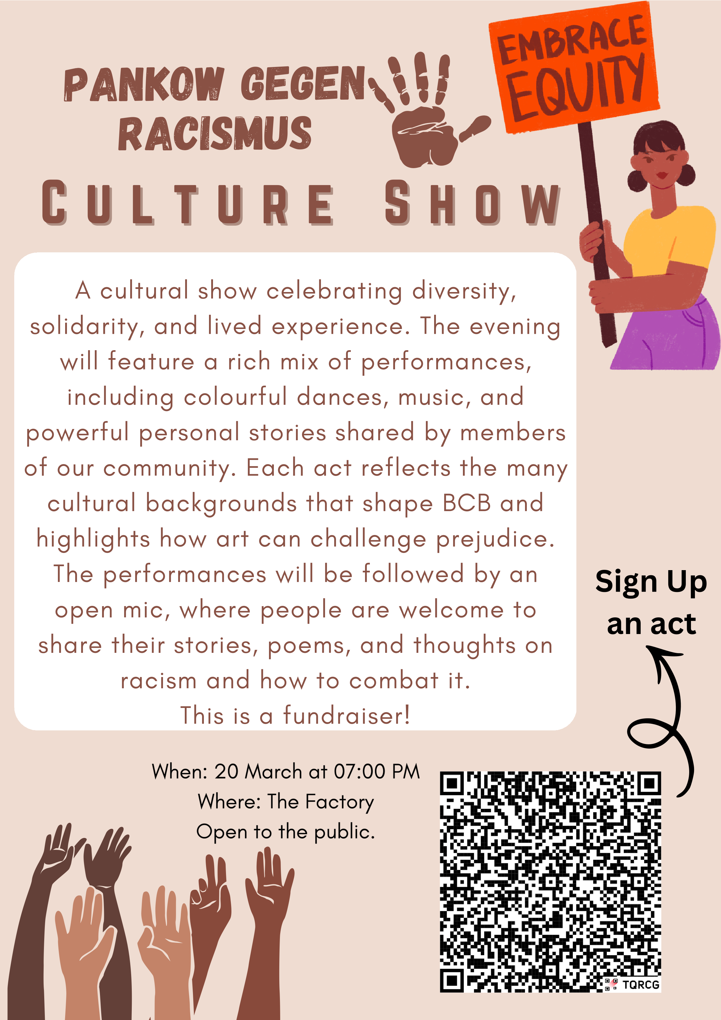 As part of the International Weeks Against Racism / Pankow gegen Rassismus, BCB is proud to present a vibrant cultural show celebrating diversity, solidarity, and lived experience. The evening will feature a rich mix of performances, including colorful dances, music, and powerful personal stories shared by members of our community. Each act reflects the many cultural backgrounds that shape BCB and highlights how art can challenge prejudice. The performances will be followed by an open mic, where people are welcome to share their stories, poems, and thoughts on racism and how to combat it.