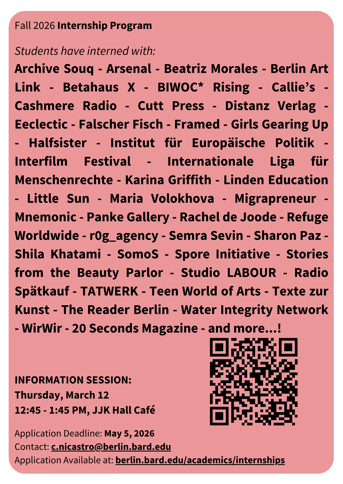 If you are a current or upcoming third-year student and curious about BCB’s Internship Program and the opportunity to gain practical experience alongside your studies while interning for an organization or individual in Berlin, please save the date.