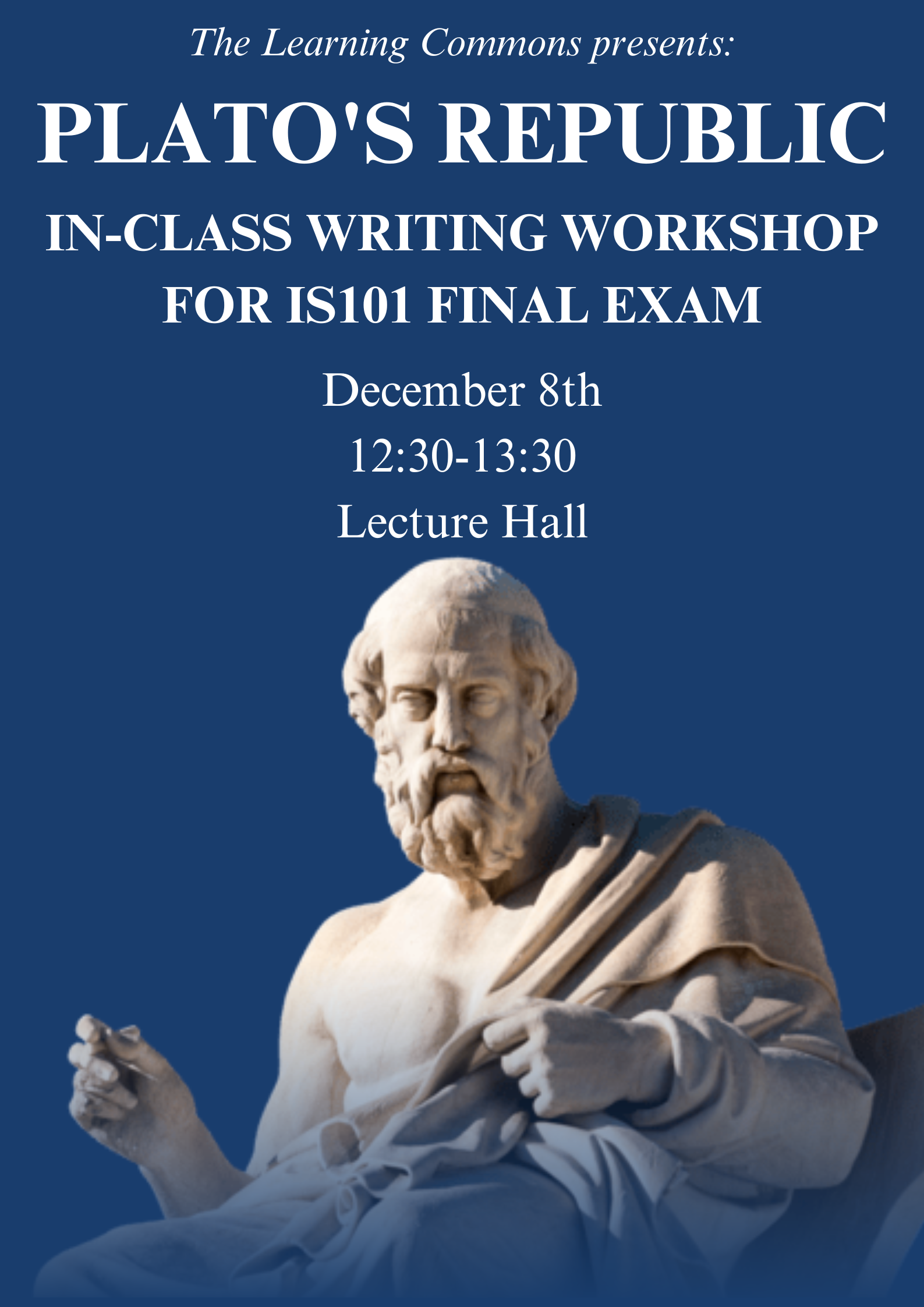 The Learning Commons presents a hands-on workshop for the IS101: Plato's Republic Final. During the session we will cover how to prepare your notes and quotes, process and respond to questions, and manage your time for in-class writing.