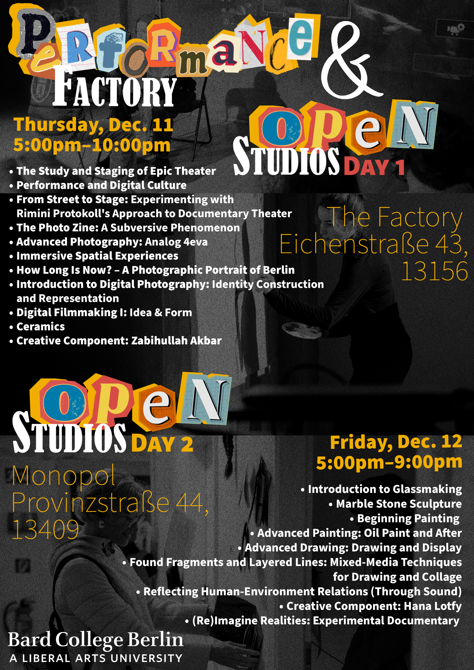 Open Studios and Performance Factory on Thursday, December 11 consists of exhibitions and performances by students from the following classes: