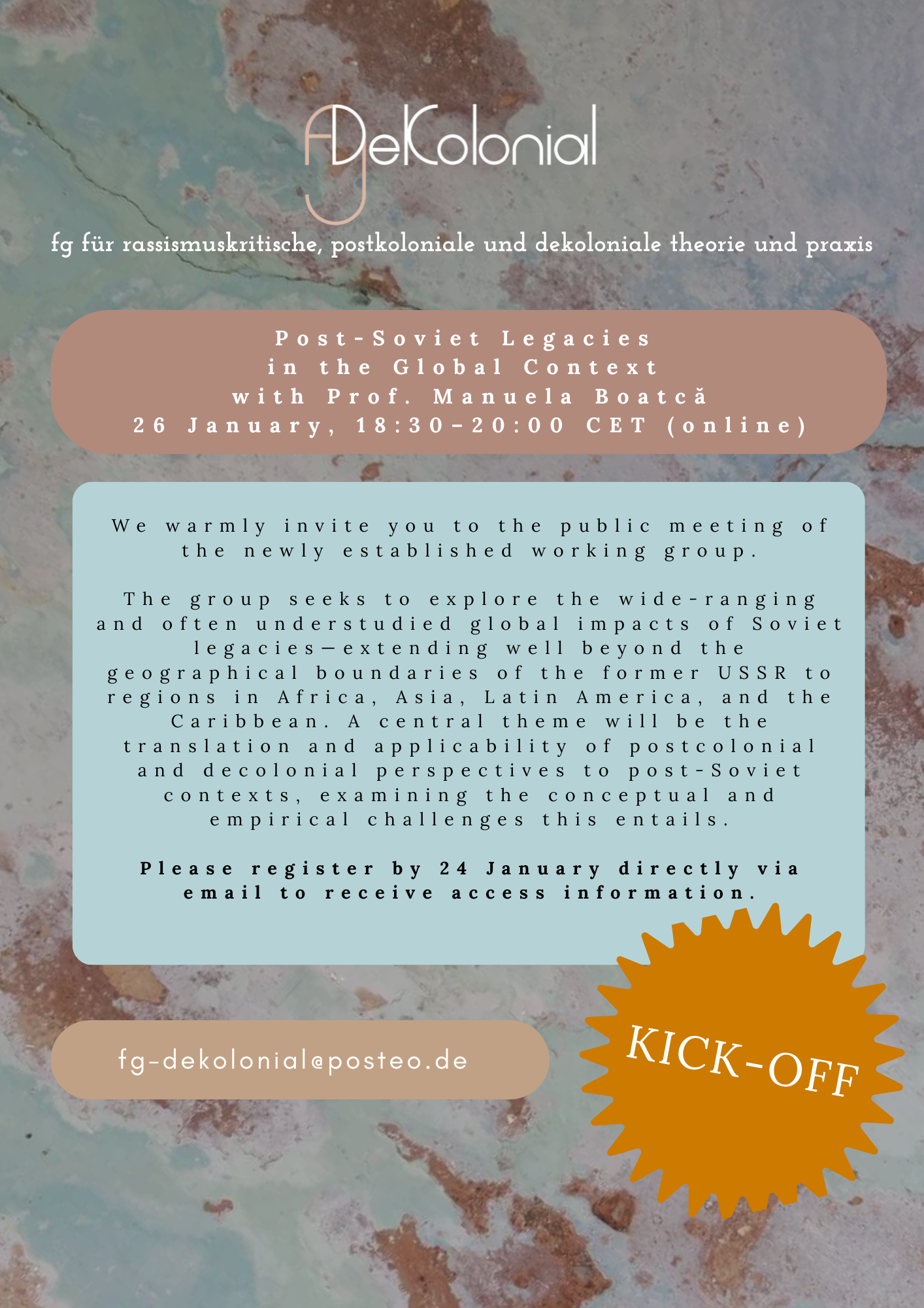 We warmly invite you to a public meeting of the newly established working group, Post-Soviet Legacies in the Global Context. Convened as part of FG DeKolonial, an association for antiracist, postcolonial, and decolonial thought and practice, the group seeks to explore the wide-ranging and often understudied global impacts of Soviet legacies extending well beyond the geographical boundaries of the former USSR to regions in Africa, Asia, Latin America, and the Caribbean. We are interested in the translation and applicability of postcolonial and decolonial perspectives to post-Soviet contexts and examining the conceptual and empirical challenges this entails.