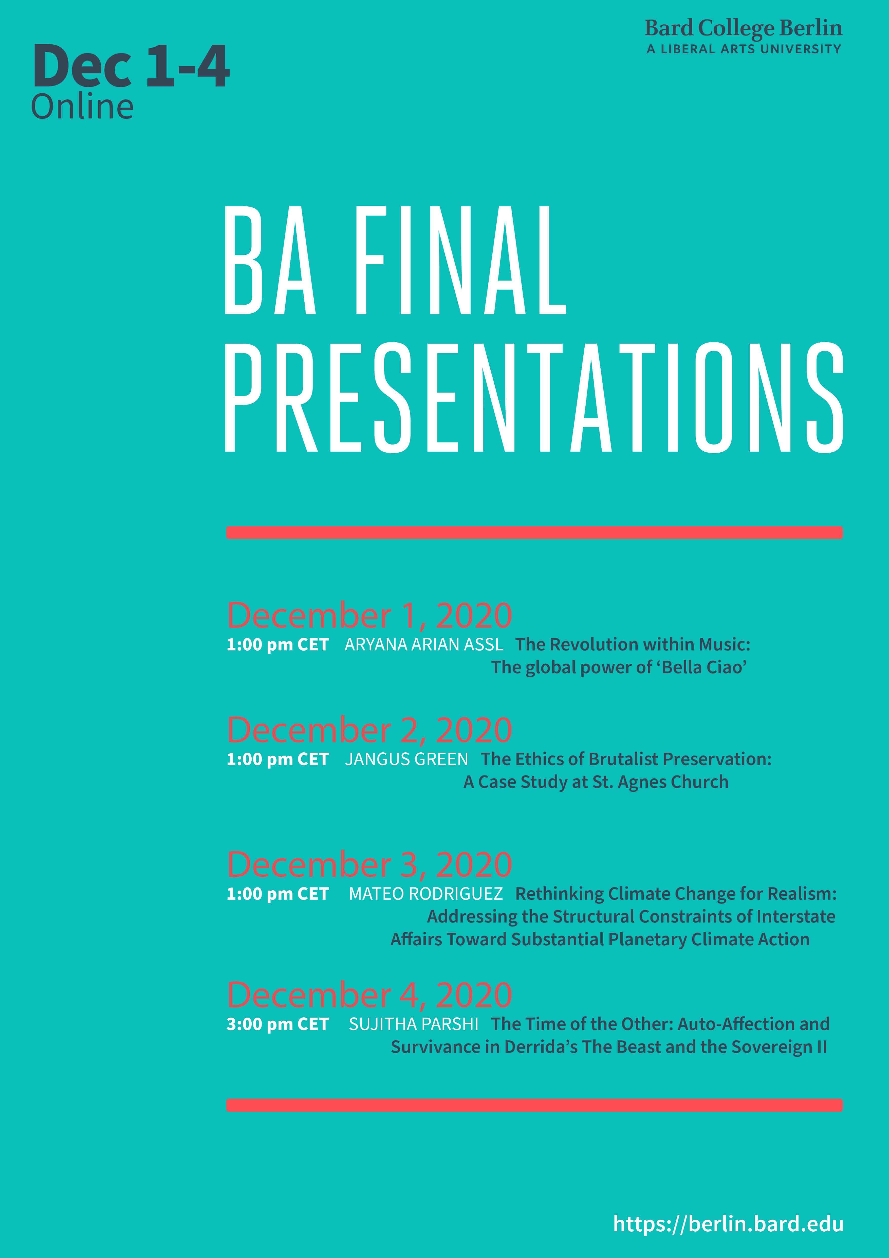 You are cordially invited to attend this year's online Senior Thesis Presentations. The Presentations are an essential step towards graduation and are an established and cherished event in the BCB academic year.