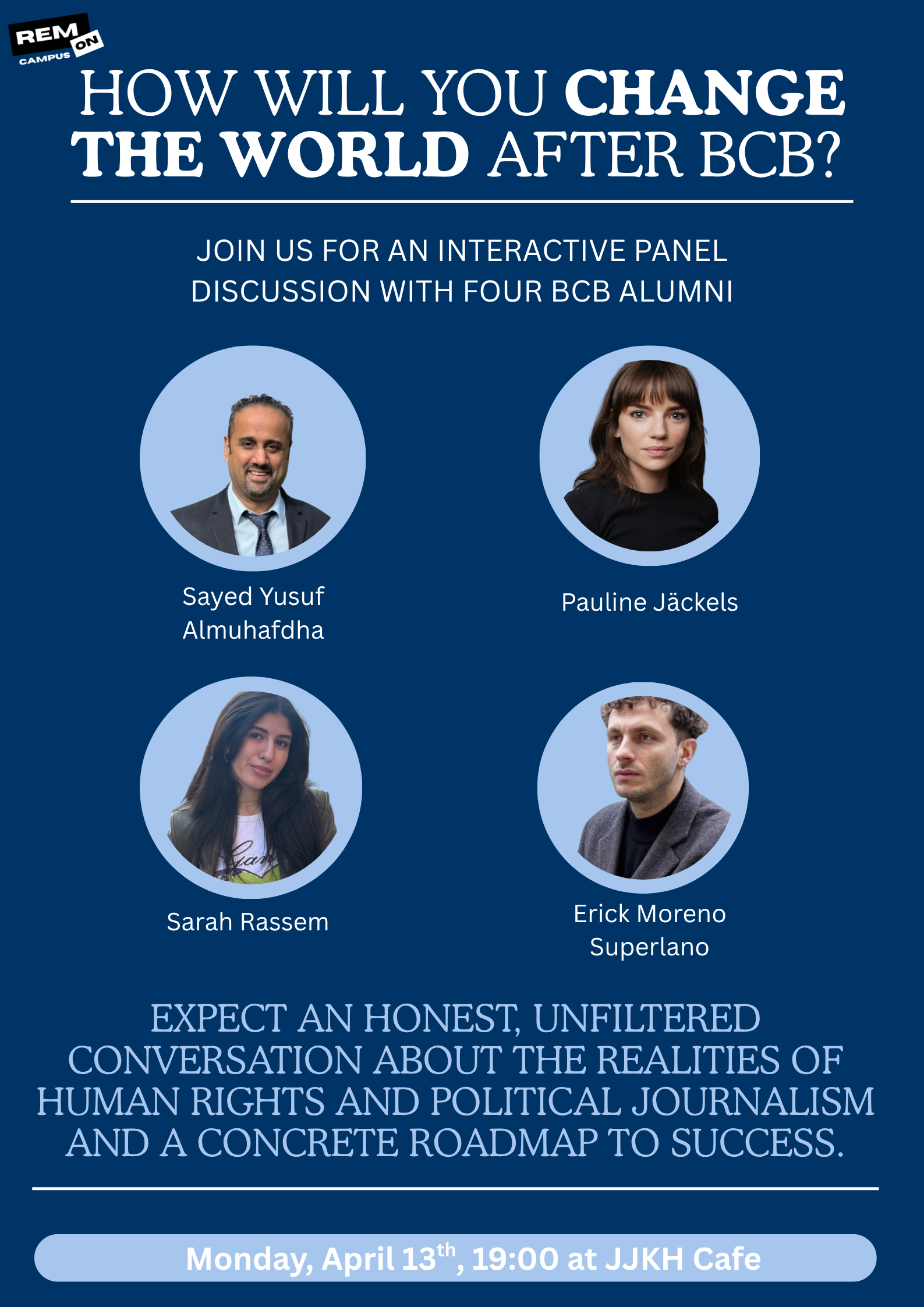 On April 13th at 19:00, REM on Campus are bringing back four BCB alumni who are on the frontlines of human rights, political journalism, and migration to show you how it’s done. Expect an honest, unfiltered conversation about the realities of the field and a concrete roadmap to success. Bring your biggest questions for the interactive Q&A!