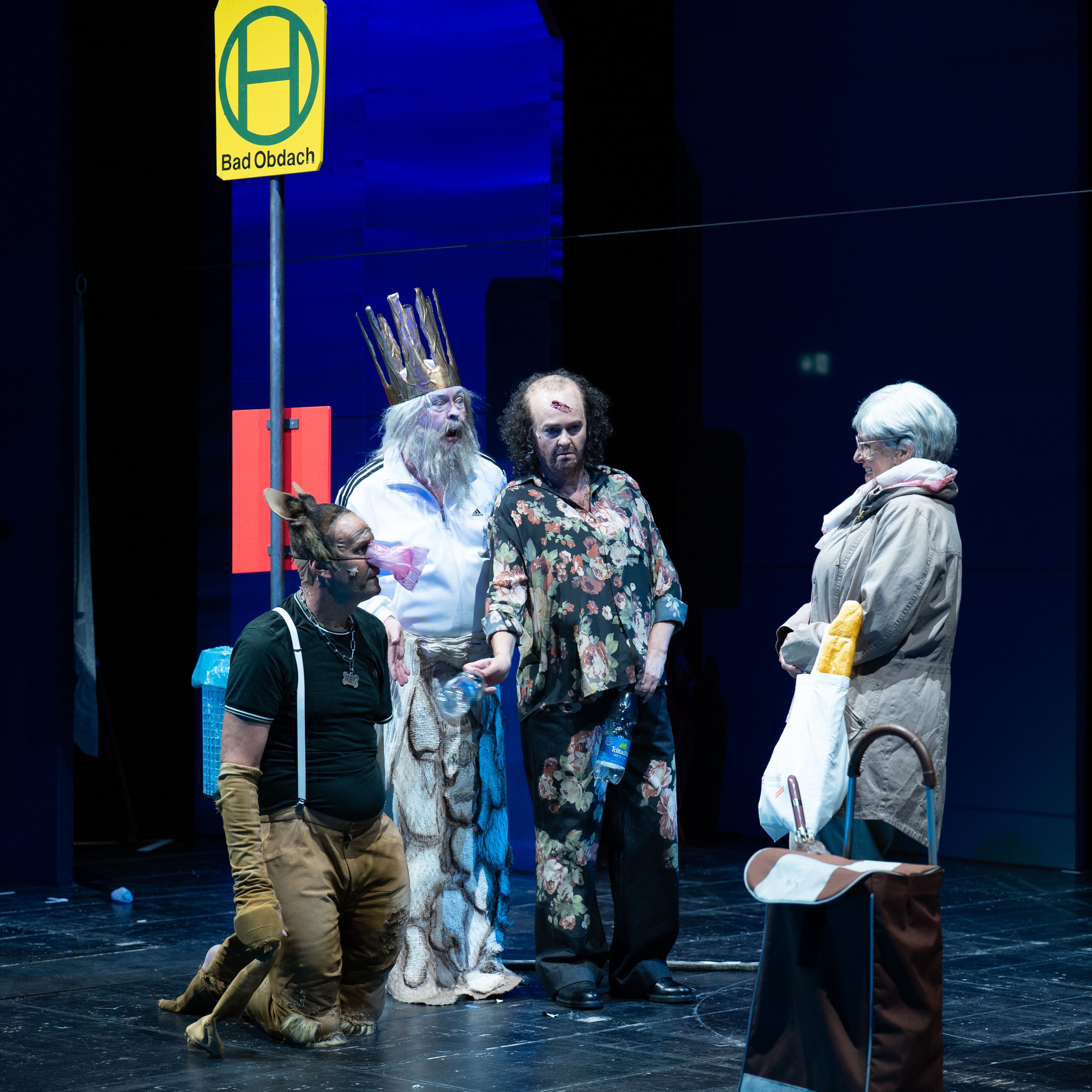 “It was great fun to design costumes for the first part with its wild, archaic, almost fairy tale-like characters and to invent quick theatrical scene changes for the stage,” she says. “In the second part, the naturalistic costumes take a back seat and give space to Schaumberger's complex video essay. An exciting contrast emerges, with both parts taking a look at the relationship between artistic work and the political and social context in which it is created.”