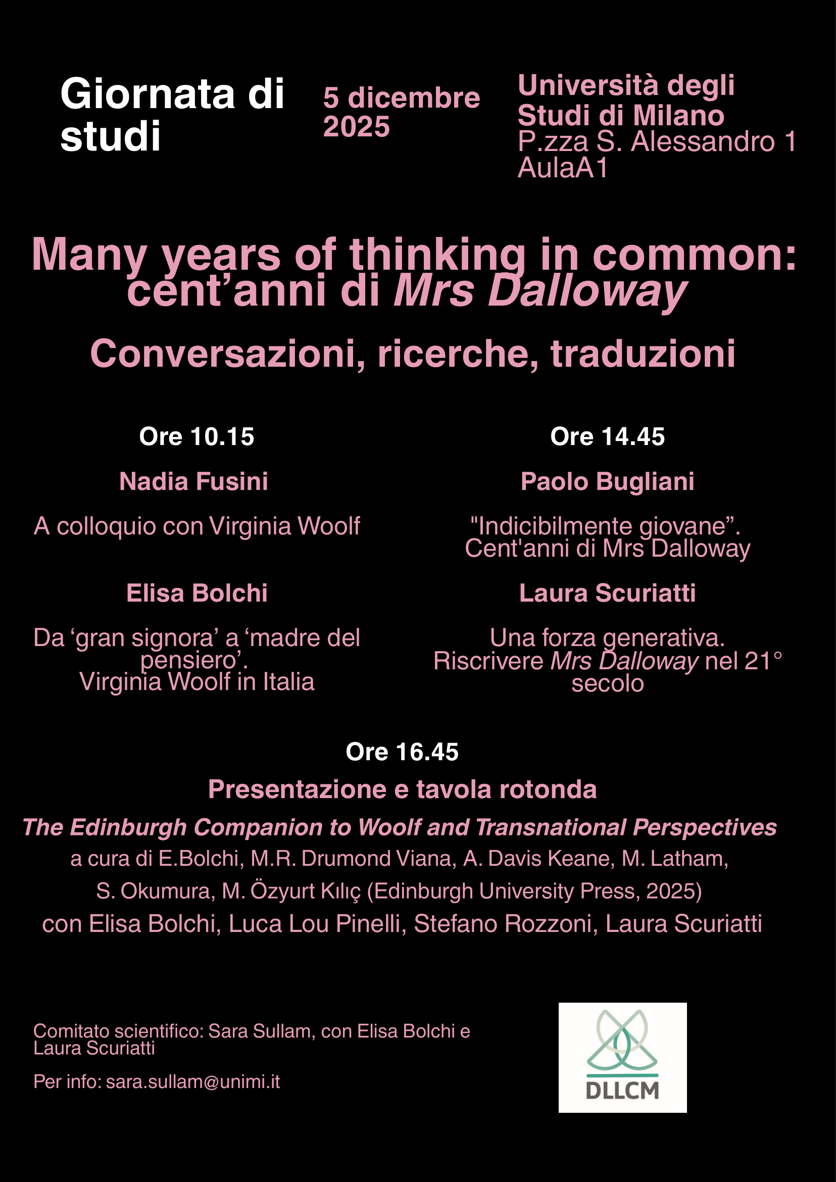 Mrs Dalloway in the 21st century) at Milan State University on December 5, 2025. The talk offered an overview of some of the most recent rewritings of
